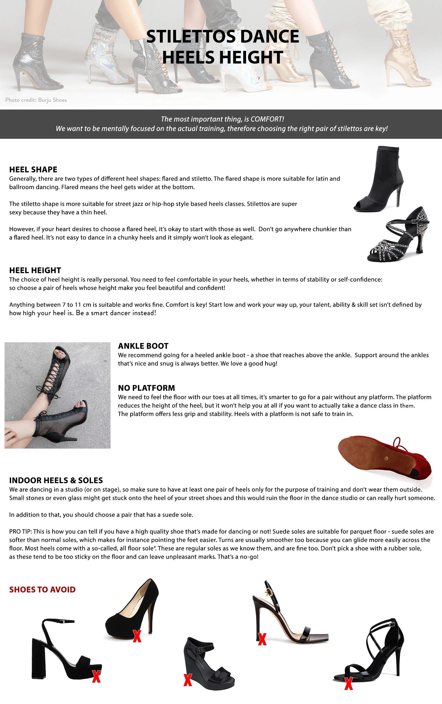 You can choose to dance barefoot, in socks or wearing shoes designed specifically for pole dancing. Take note that those shoes are only to be worn inside the studio. No other shoes are allowed. Some pole shoe brands you can consider are Pleasers or Hella Heels, but do your research before purchasing too!